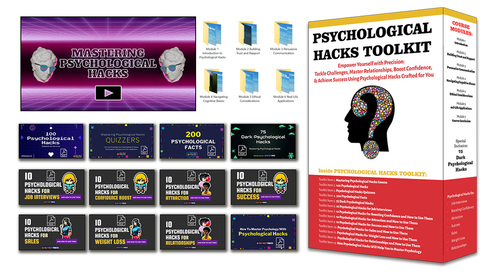 Toolkit Item 1: Mastering Psychological Hacks Course (7 Modules Video Course) + Toolkit Item 2: 100 Psychological Hacks (207 Pages PDF) +Toolkit Item 3: Psychological Hacks Quizzers (42 Pages PDF) + Toolkit Item 4: 200 Psychological Facts (203 Pages PDF) + Toolkit Item 5: 75 Dark Psychological Hacks (157 Pages PDF) + Toolkit Item 6: 10 Psychological Hacks for Job Interviews (42 Pages PDF) + Toolkit Item 7: 10 Psychological Hacks for Boosting Confidence and How to Use Them (61 Pages PDF) + Toolkit Item 8: 10 Psychological Hacks for Attraction and How to Use Them (56 Pages PDF) + Toolkit Item 9: 10 Psychological Hacks for Success and How to Use Them (58 Pages PDF) + Toolkit Item 10: Psychological Hacks for Sales and How to Use Them (55 Pages PDF) + Toolkit Item 11: Psychological Hacks for Weight Loss and How to Use Them (58 Pages PDF) + Toolkit Item 12: Psychological Hacks for Relationships and How to Use Them (59 Pages PDF) + Toolkit Item 13: How Psychological Hacks Will Help You to Master Psychology (30 Pages PDF)
