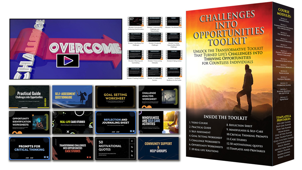 Challenges into Opportunities Video Course (12 Modules) + Practical Guide (90 Pages PDF) + Self-Assessment Questionnaire (26 Pages PDF) + Goal Setting Worksheet - Professional and Personal (40 Pages PDF) + Challenge Analysis Worksheets (20 Pages PDF) + Opportunity Identification Worksheets (20 Pages PDF) + 10 real-life scenarios where challenges can be turned into opportunities (104 Pages PDF) + Reflection and Journaling Sheet (20 Pages PDF) + Mindfulness and Self-Care Activities (50 Pages PDF) + Prompts for Critical Thinking (24 Pages PDF) + Case Studies and Success Stories (36 Pages PDF) + 50 motivational quotes for converting Challenges into Opportunities (54 Pages PDF)
